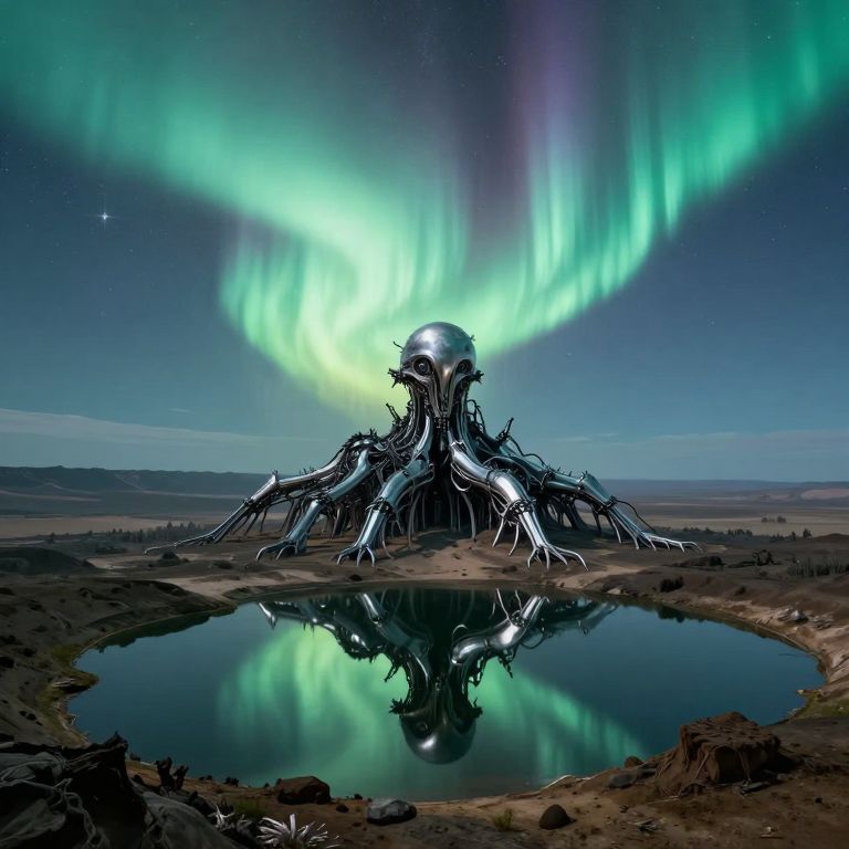 This digital artwork depicts a surreal landscape under a vivid aurora borealis. A metallic, alien-like structure with intricate, mechanical tendrils stands prominently in the center, reflecting in a nearby circular pond. The structure has a spherical head and is surrounded by barren, rocky terrain. The sky is a deep blue, adorned with glowing green and purple northern lights. The background includes distant, hazy mountains. The overall style is hyper-realistic with a sci-fi twist, blending natural elements with futuristic technology. The colors are vivid, and the textures of the metallic structure and rocky ground are highly detailed.
