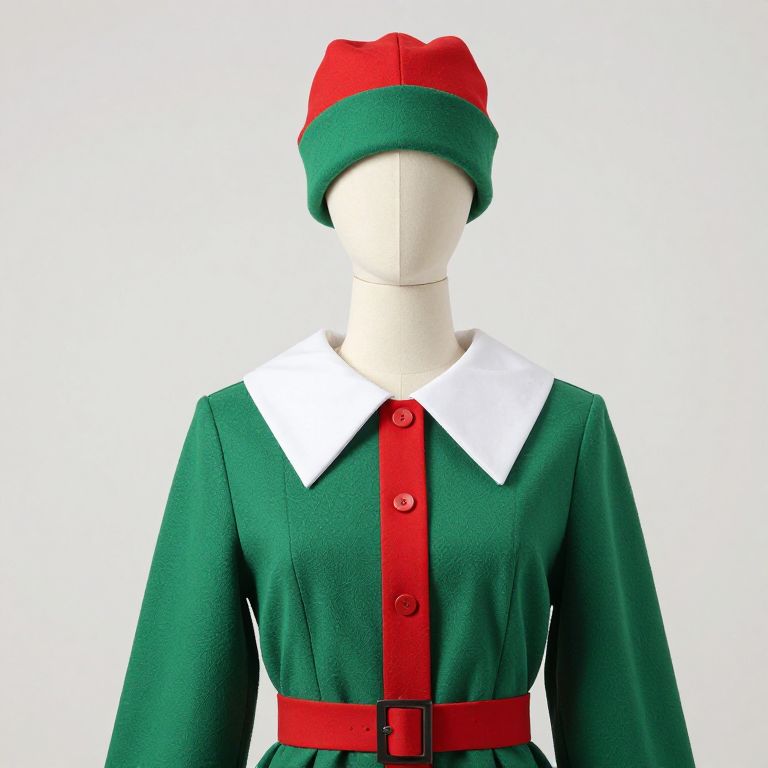 Mannequin wearing a red and gold outfit with a Santa hat on his head.