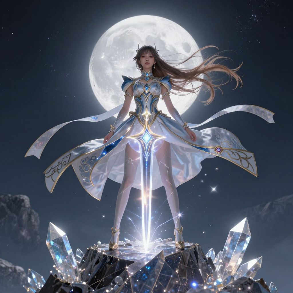 Digital artwork of a powerful female warrior standing on a rocky peak under a bright full moon. She has long, flowing brown hair and wears an ornate, metallic, and white dress with gold accents and a glowing, translucent cape. She holds a radiant, glowing sword that illuminates her figure. Her dress reveals her toned legs, and she stands confidently with one foot on a crystal, surrounded by other sparkling crystals. The night sky is dark with stars, and jagged mountains are visible in the background. The overall style is fantasy-themed with a high contrast between the glowing elements and the dark background.