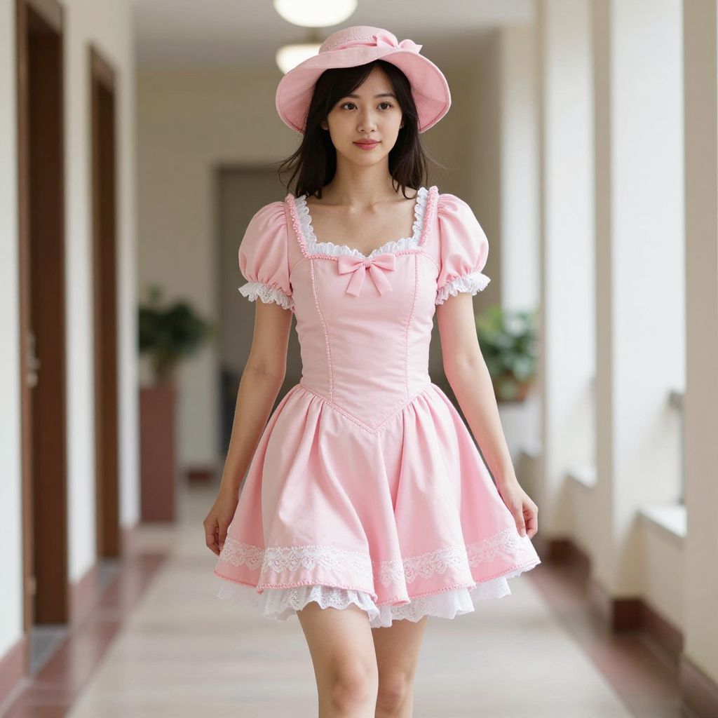 Pink Usherette Costume, woman in pink dress and pink hat walking down a hall