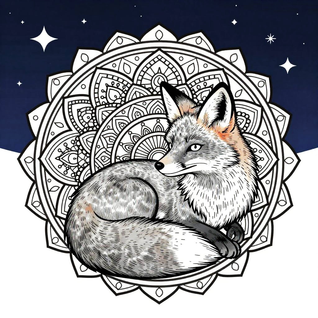 Detailed fox coloring pages displaying a serene fox curled up under a starry night sky, filled with mandala-inspired designs and decorative elements to enhance creative expression and relaxation.