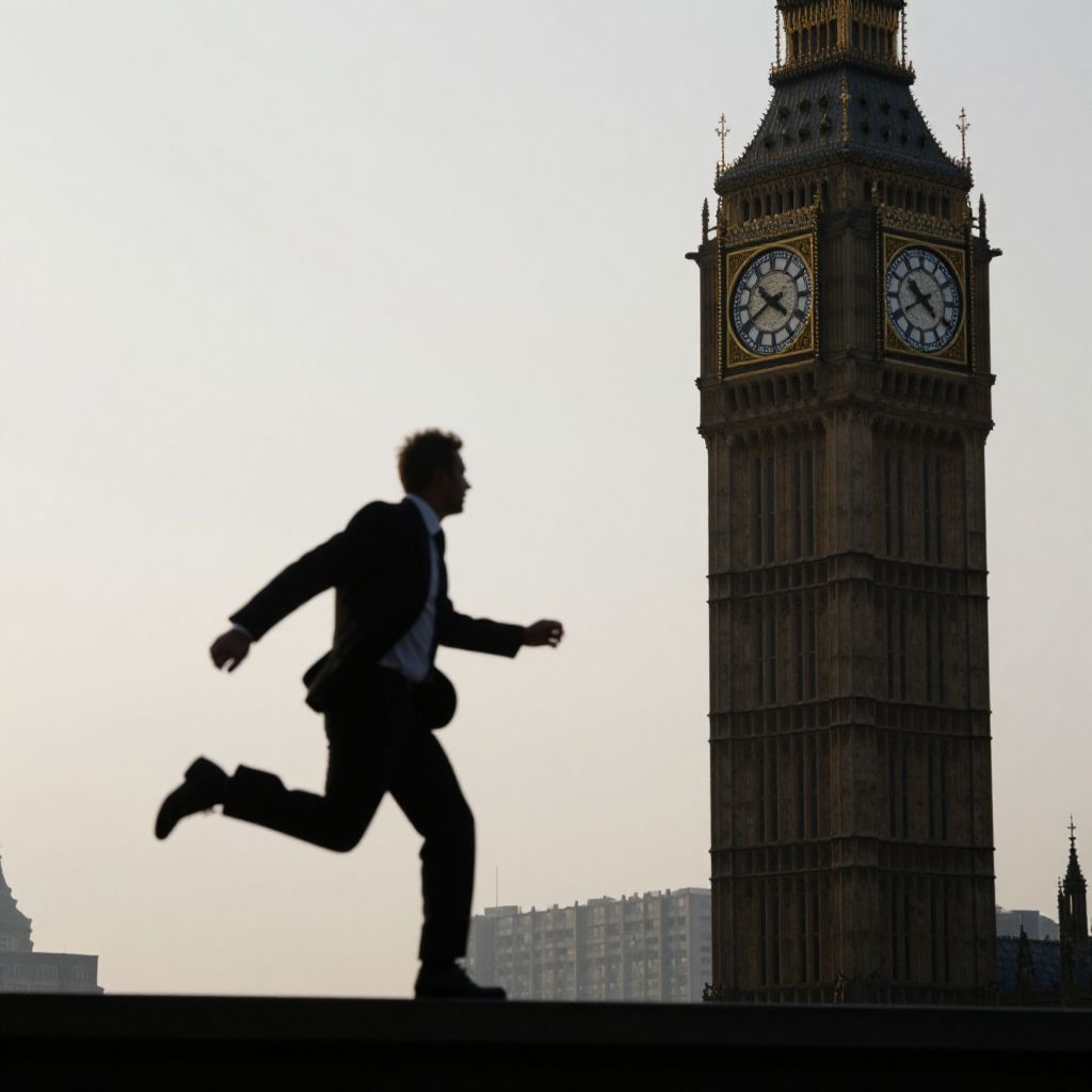 Silhouetted against a hazy backdrop, a businessman dashes past a towering clock tower, its four faces displaying identical times as his shadow leaps in sync with an unseen rhythm.
