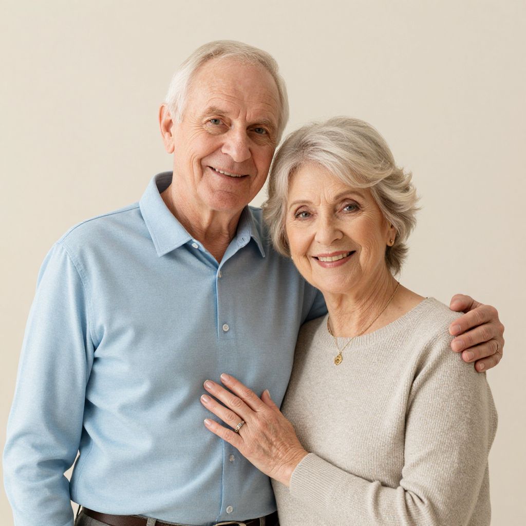 Elderly couple radiating warmth and joy celebrate their 65th anniversary with a heartwarming photo session, showcasing their enduring love and companionship as they stand close together, the man's arm affectionately draped over the woman's shoulder.