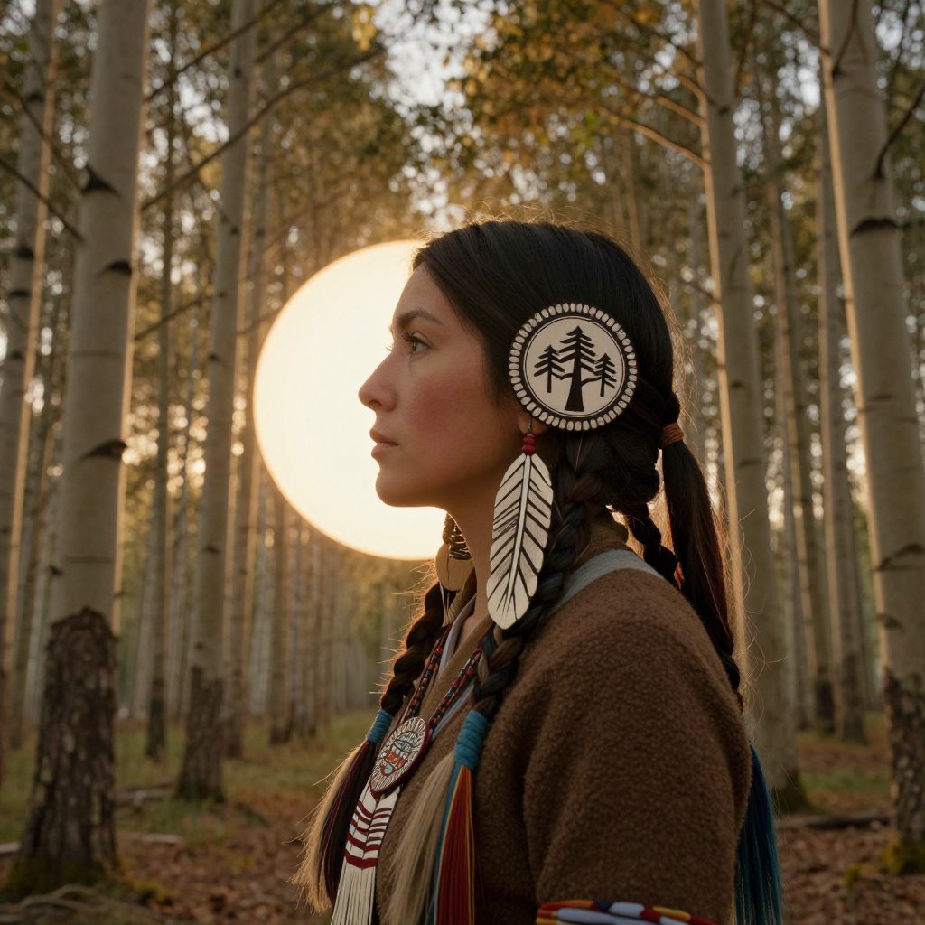 The image depicts a Native American woman in profile, her face illuminated by a large, circular light source, casting a warm glow on her features. Her hair is adorned with intricate patterns, including a prominent circular design and stylized trees, suggesting a connection to nature. The background is a serene aspen forest, with tall, slender trees reaching upwards, their trunks and branches rendered in soft, earthy tones. The overall composition is balanced, with the woman's profile centrally positioned, and the forest extending both to the left and right, creating a sense of depth and tranquility. The interplay of light and shadow, along with the detailed textures of the trees and the woman's hair, adds a rich, layered quality to the image, evoking a sense of harmony with the natural world.