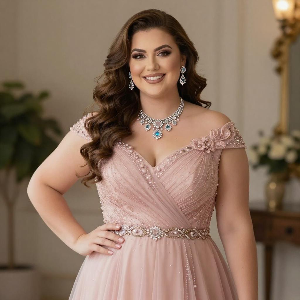 Portrait of a confident plus-size woman with long wavy brown hair wearing an elegant off-shoulder pink formal gown adorned with pearls and detailed embroidery. She accessorizes with a matching gemstone necklace and earrings, smiling radiantly in a softly lit indoor setting.
