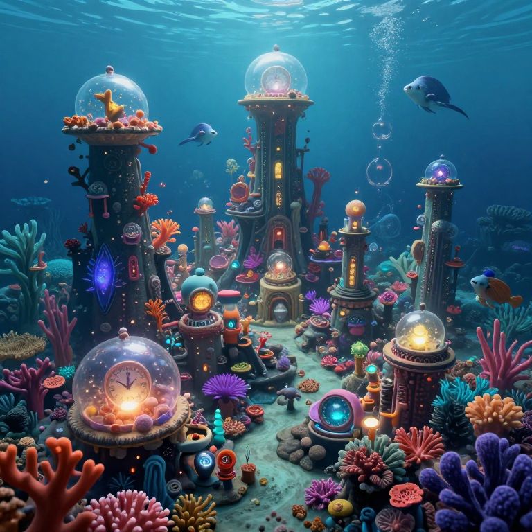 Envision an enchanting digital artwork inspired by the dreamlike visuals of surrealism, portraying an underwater metropolis where glowing flora and fauna coexist harmoniously with humanoid marine creatures. The scene captures a bird's eye view above the colorful coral reef cityscape, featuring domed structures resembling liquid timepieces, seamlessly merging reality and imagination in a whimsical yet thought-provoking composition that sparks curiosity and wonder.