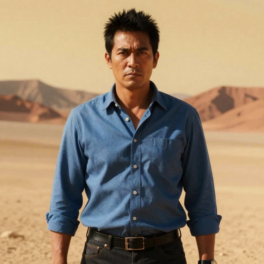 Photograph of a shirtless middle-aged man with medium-length, grayish-brown hair, looking slightly to the side with a serious expression. Background features pink, rocky desert mountains. Blurred secondary figure partially visible behind the main subject.