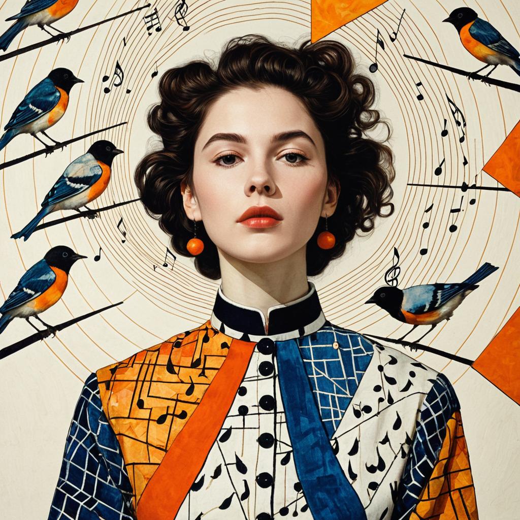 A surreal textured portrait of a young woman with a porcelain complexion and neutral expression, styled in a vibrant patterned blouse featuring blues and oranges with a mandarin collar. Surrounding her are birds perched gracefully, integrated with swirling musical notes and abstract geometric patterns, creating a kaleidoscopic aura in the background.