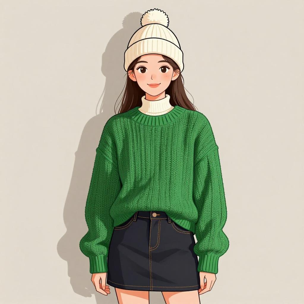 Woman with pretty face and pretty hair. smiling Woman, casual winter, chunky knit green sweater, long sleeve, ribbed hem and cuffs, layered over white turtleneck, dark denim miniskirt, white pom-pom beanie with red and white striped detail, neutral plain wall background. --sref 1467