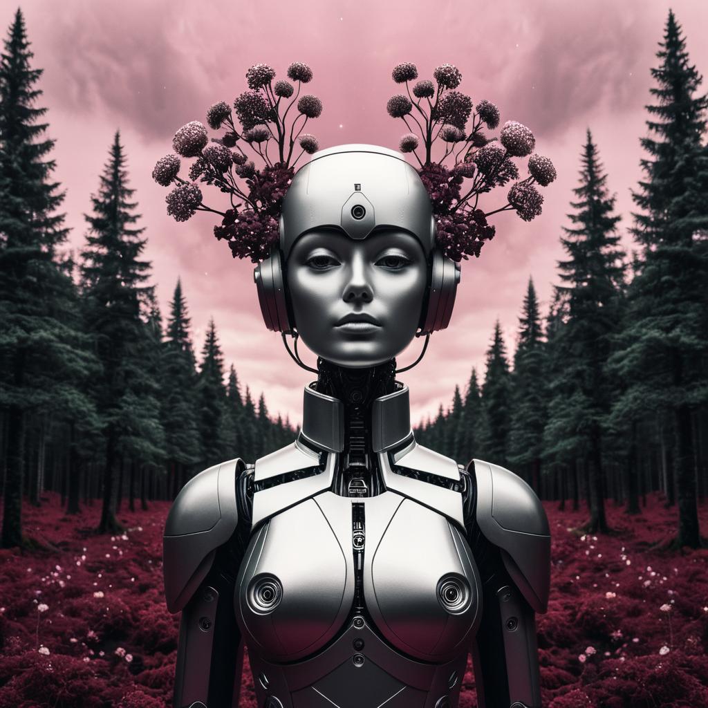 M.C. Escher-inspired scene of a bronze robot man with crystals and ivy in his head, standing in an infinite green field under a morning sky with light fog, surreal and dreamlike atmosphere