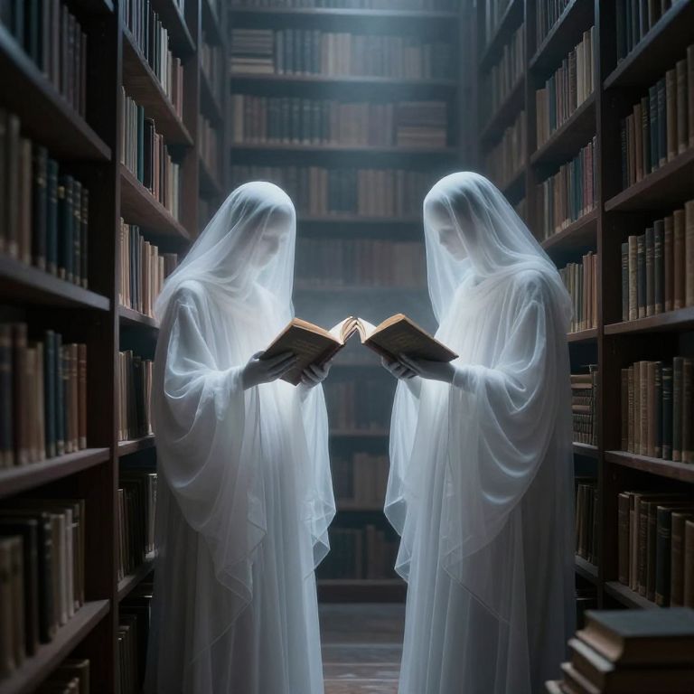 In a hauntingly ethereal library illuminated by soft, otherworldly light, two ghostly figures draped in flowing white veils stand amidst towering bookshelves, their forms partially obscured by swirling mist as they intently read ancient tomes, evoking a surreal and atmospheric digital art composition.