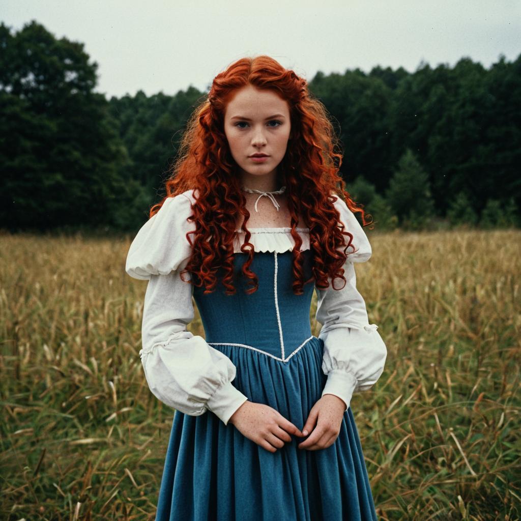Anne costume,1girl, solo, dress, freckles, long hair, realistic, long sleeves, outdoors, red hair, standing, arms at sides, puffy sleeves, closed mouth, curly hair