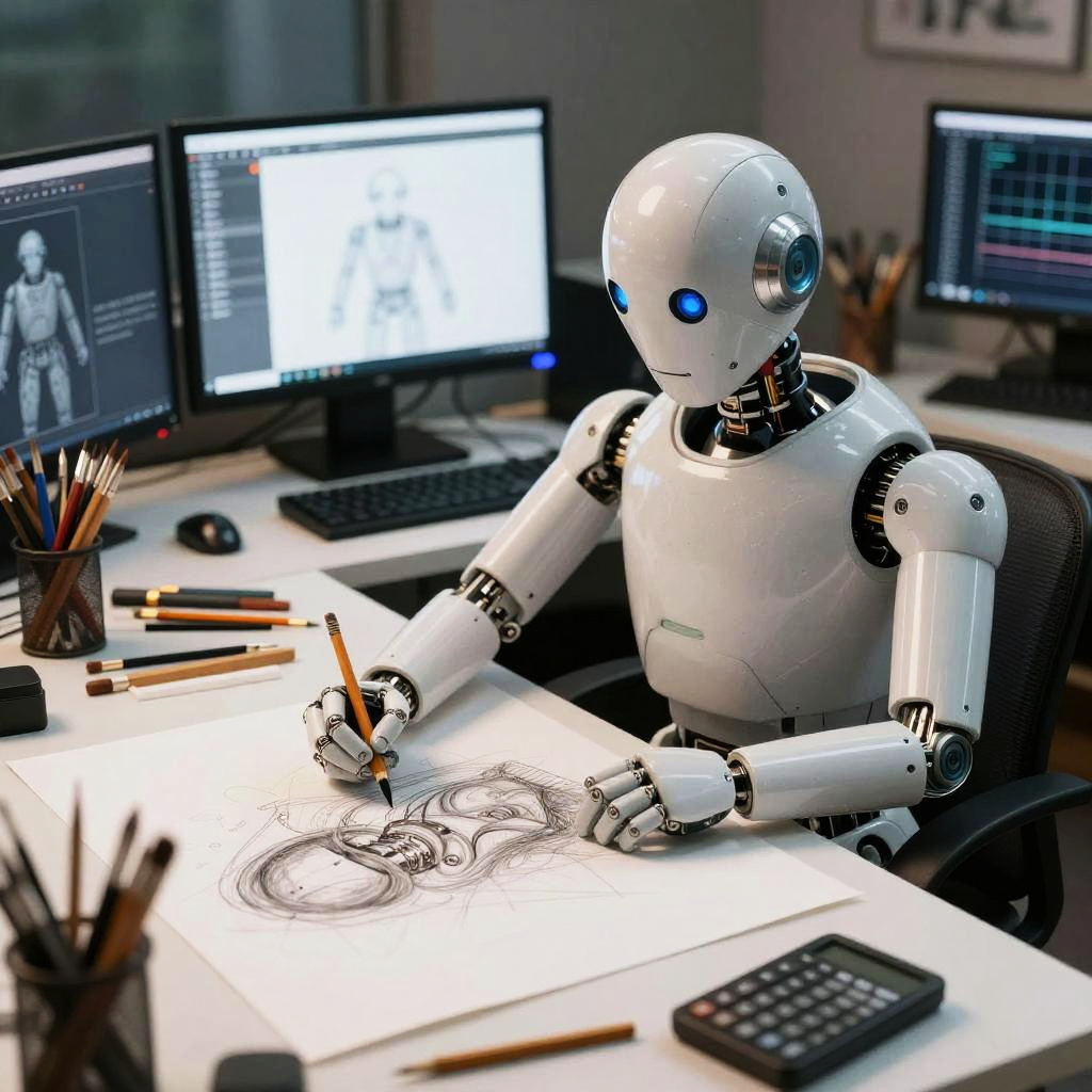 AI generator drawing of a creative android sitting at a desk filled with traditional drawing tools and digital screens, producing a hybrid art piece, soft lighting, realistic textures, emphasizing innovation and creativity