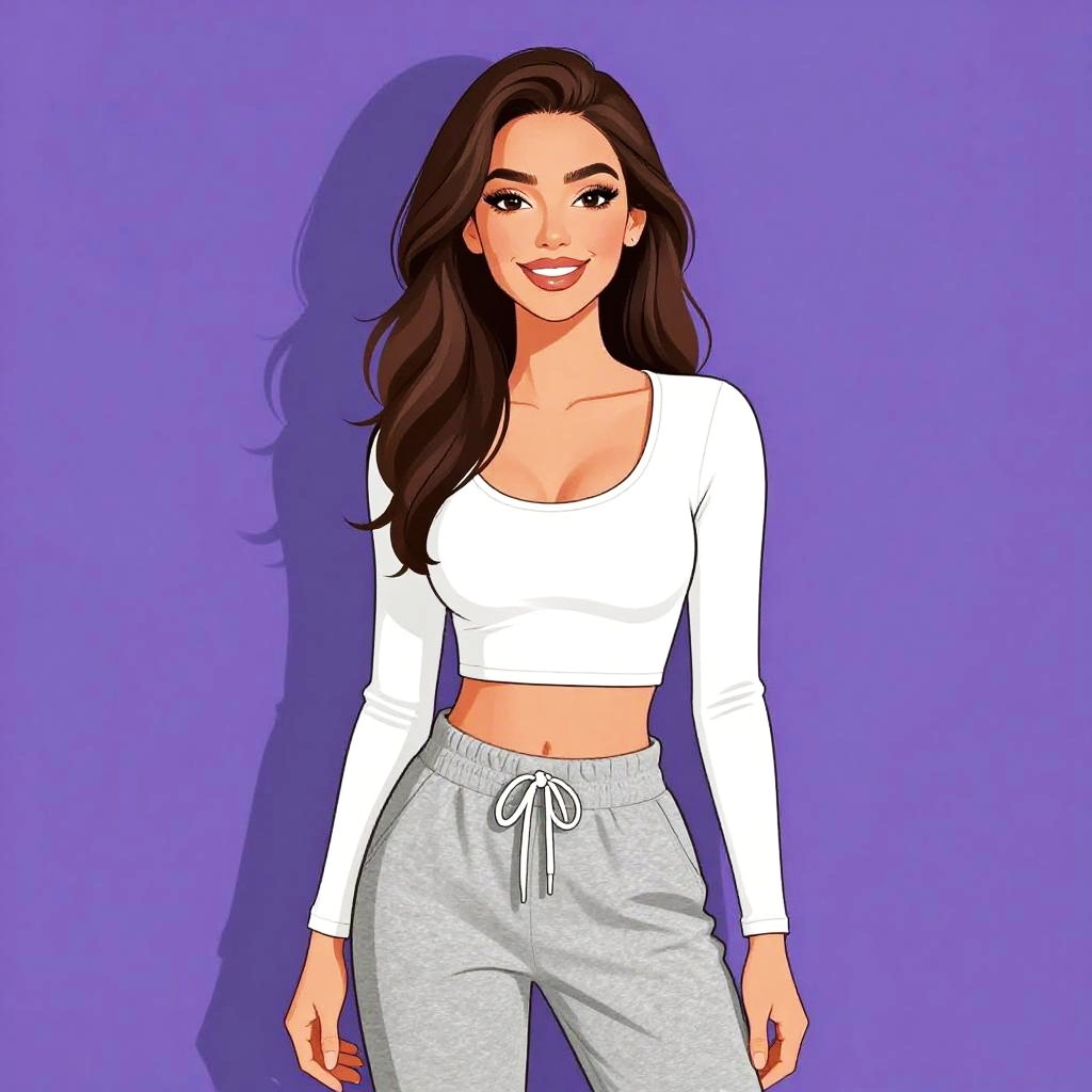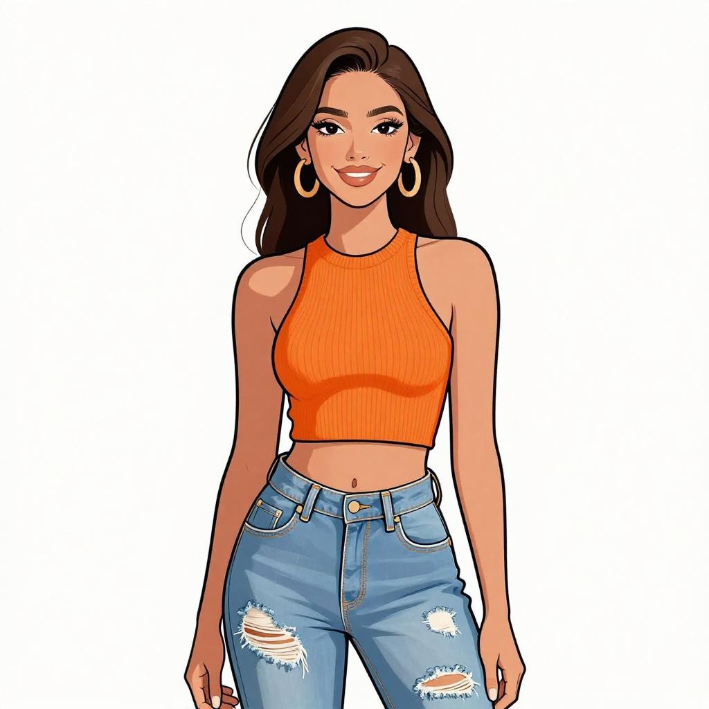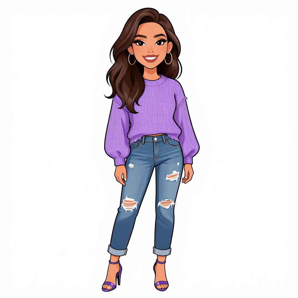 Woman with pretty face and pretty hair. smiling Woman, casual chic, ribbed periwinkle turtleneck sweater, long sleeves, fitted silhouette, frayed denim shorts with a high waist, distressed details, large hoop earrings, light makeup, white seamless background. --sref 1467