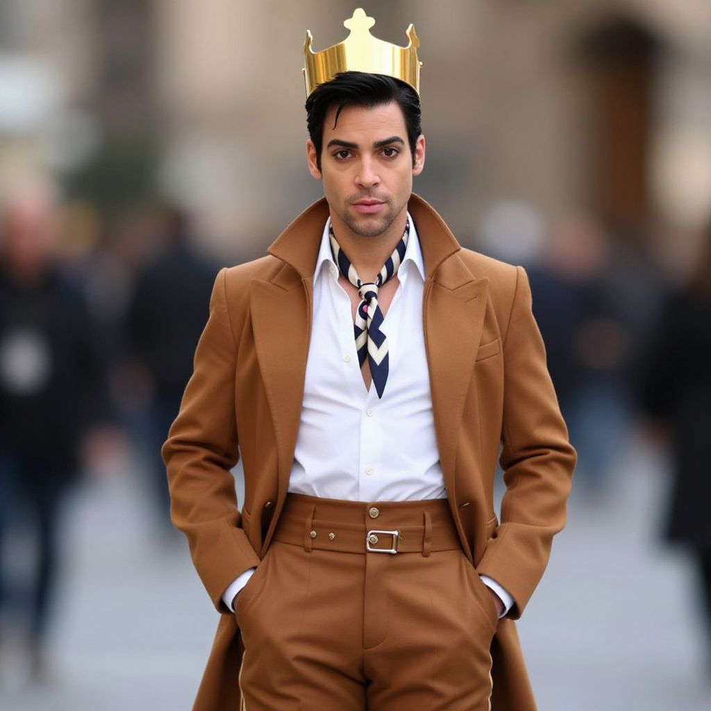 Artist prince costume, male focus, 1boy, looking at viewer, hands in pockets, blurry background, coat, blurry, crown, outdoors, pants, brown pants, black hair, shirt, white shirt, jacket, standing, realistic, buttons, solo focus, hat, cowboy shot, closed mouth, ascot, solo, open clothes, black eyes, facial hair