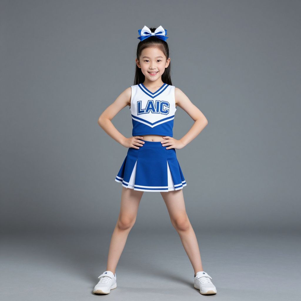 Photograph of a young Asian girl in a blue and white cheerleader outfit, "LACS" on top, blue bow in hair, white shoes