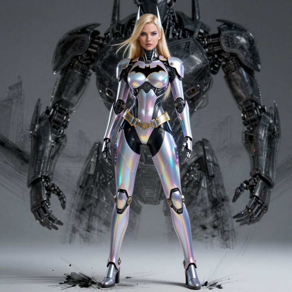 (best quality, 4k, 8k, highres, masterpiece:1.2), ultra-detailed, realistic, The masterpiece is a beautiful AI girl with long blond hair and sky blue eyes. She is dressed in a mechanized batgirl suit, She is intricately designed, elegant, and highly detailed, appearing extremely life like and photo realistic in her full body form. masterpiece, best quality, a Hi-Tech female solar punk style, Hi-Tech solar punk batgirl suit, Custom Hi-Tech solar punk suit design, shining body, glowing, full_body, full shining Hi-Tech solar punk suit body, hues, cyberpunk style, perfect custom Hi-Tech solar punk suit, Movie Still, cyberpunk, solar punk, action_pose, cinematic scene, intricate mech details, ground level shot, 8K resolution, Cinema 4D, Behance HD, polished metal, shiny, Unreal Engine 5, rendered in Blender, sci-fi, futuristic, trending on Artstation, epic, cinematic background, dramatic, atmospheric, cyborg style, mecha, se ink drawing, robot, ink scenery, cyborg, photo r3al