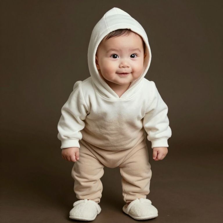 A baby is wearing a soft beige outfit with a white hoodie and a pair of cozy white slippers, standing against a dark, muted background. The baby has round, expressive eyes, a gentle smile, and a small, chubby face, with soft, natural skin tones. The lighting is soft and warm, casting gentle shadows, creating a tender and inviting atmosphere. The scene is simple and peaceful, emphasizing the innocence and charm of the baby.