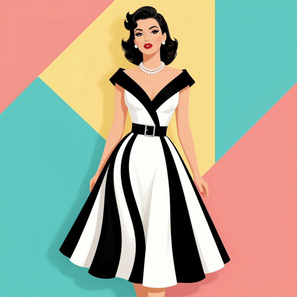 Digital illustration of a stylish woman with fair skin and black, wavy, mid-length hair. She wears a sleeveless, black and white, V-neck dress with a black belt at the waist and a pearl necklace. Her red lipstick contrasts with her pale complexion. The background features diagonal pastel stripes in pink, yellow, and turquoise. The woman stands confidently, her dress flaring out, creating a retro, 1950s-inspired look. The overall style is bold and colorful, with a pop art aesthetic.