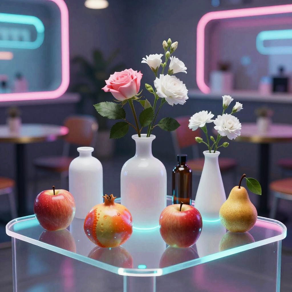 Futuristic holographic projection, transparent acrylic table in a neon-lit cyber café, still-life featuring three white vases of varied shapes and a small brown bottle with a dark top; pink roses and white flowers with lively green leaves; fruits arranged around them: a red apple, a yellow-orange pomegranate, another red apple, and a small brown pear with a green leaf; pulsing LED underlighting with foggy ambient; realistic textures, crisp edges, gentle reflections, soft falloff, color-true, editorial quality
