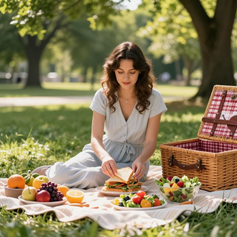 Luncher preparing a vibrant picnic lunch outdoors, surrounded by fresh fruits, sandwiches, and colorful salads, sunlight filtering through green trees, detailed with a cozy blanket and rustic picnic basket, in a serene park setting, high detail, soft natural lighting