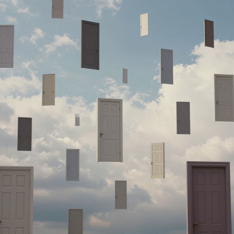 Photograph of a surreal scene featuring multiple white and dark gray doors of various sizes floating in a bright, partly cloudy sky. The doors are suspended mid-air, creating a dreamlike effect. In the lower corners, two solid white doors and one dark gray door are fixed to a wall, contrasting with the floating doors. The sky is blue with white and gray clouds, adding depth and a sense of openness to the composition. The image combines elements of reality and fantasy, creating a visually intriguing and whimsical scene.