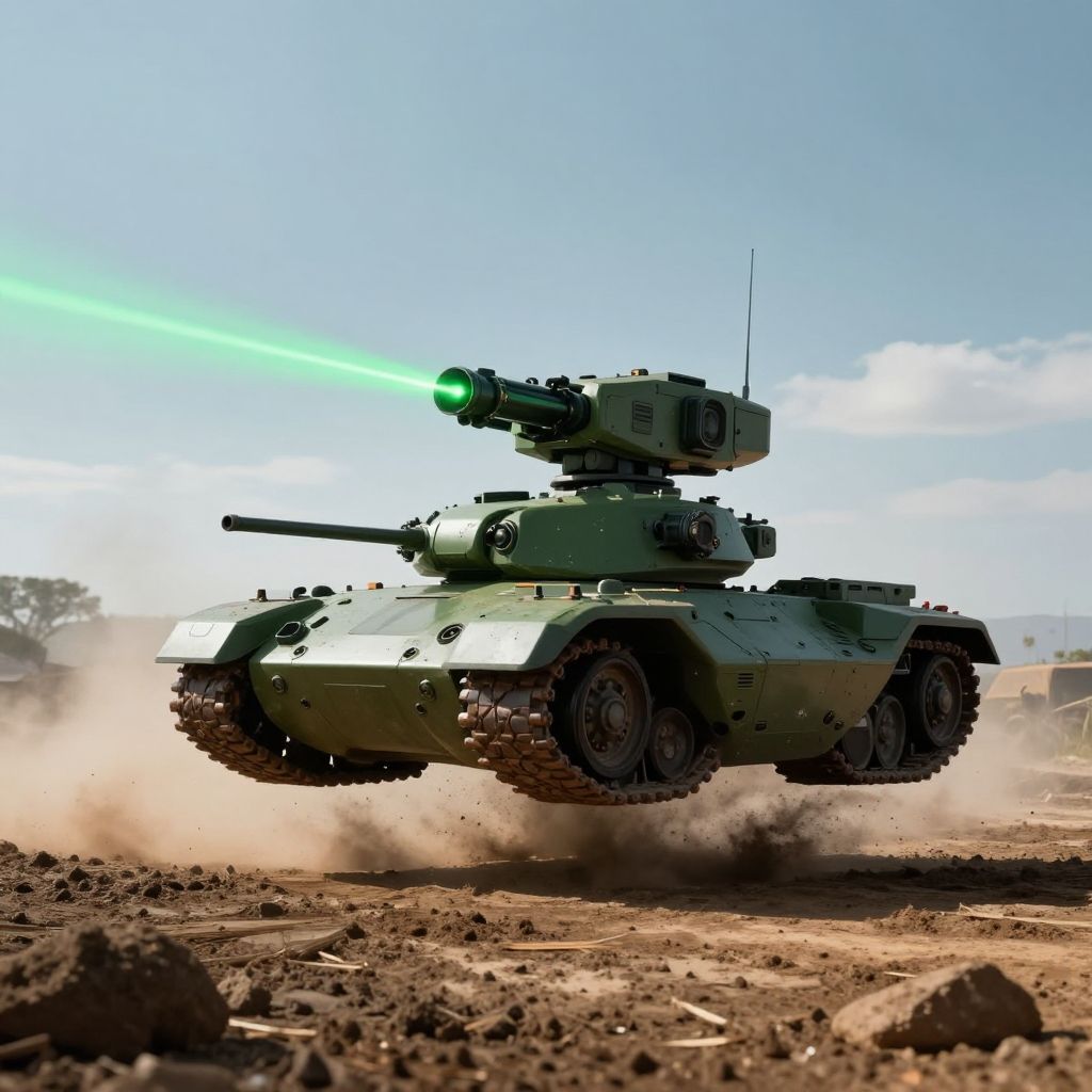 Photograph of a green, advanced tank with a glowing green laser cannon, flying over a dusty, rocky terrain under a clear blue sky.
