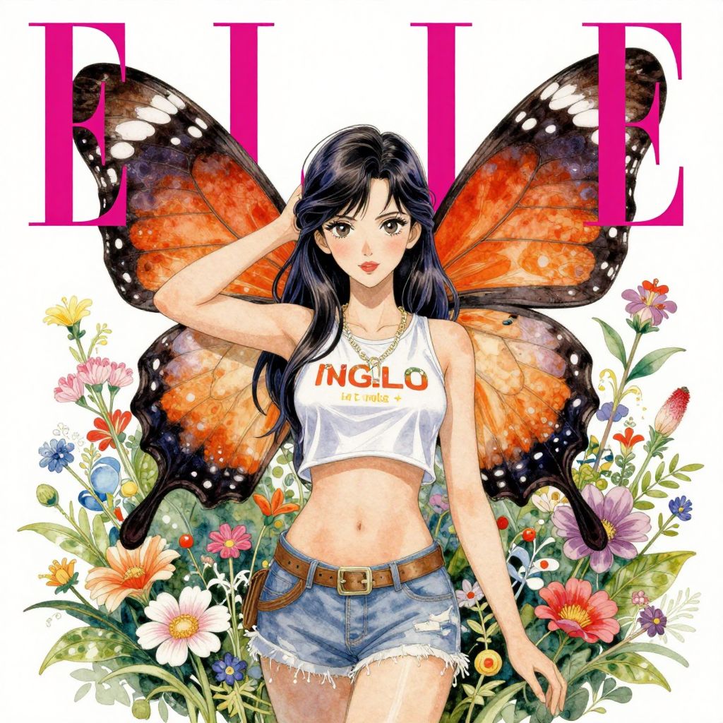 Woman with butterfly wings, vogue magazine, elle magazine, greg rutkowski, gerardo dottori, john singer sargent, anime, trending on artstation, watercolor painting, intricate, flower garden, crop top