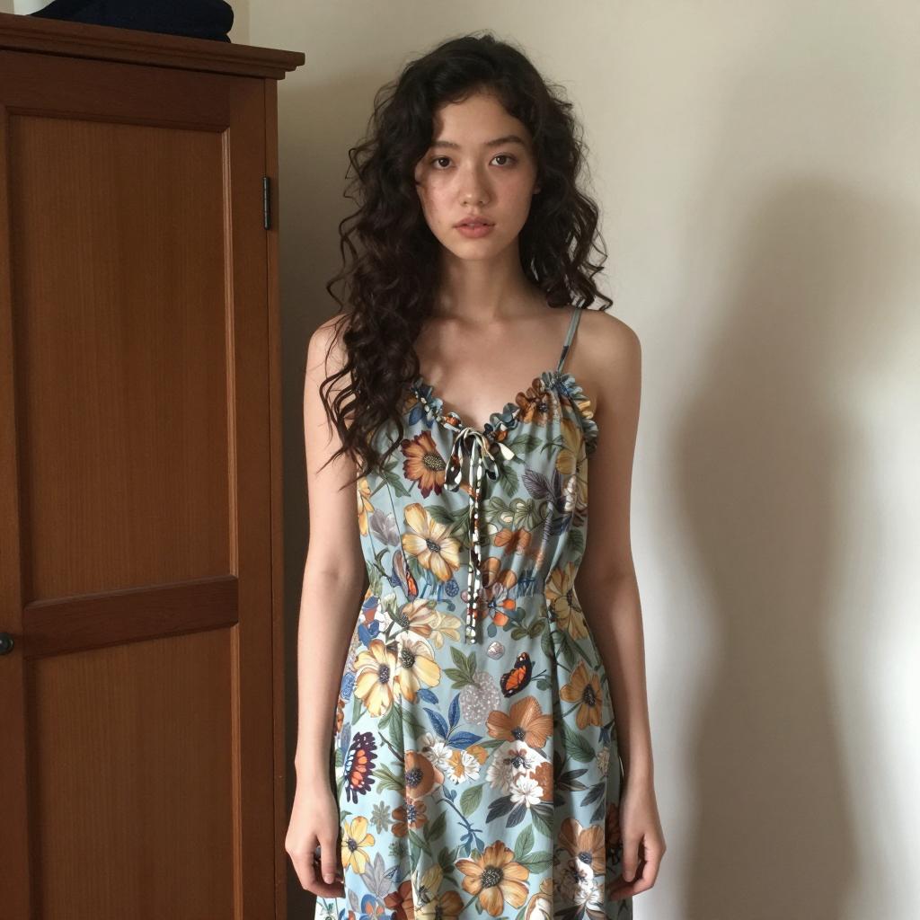 A young woman with long curly hair wearing a vintage patterned sundress standing indoors near a wardrobe, casual fashion style, natural light illuminating her softly, nostalgic vintage ambiance, soft contrast, muted color tones
