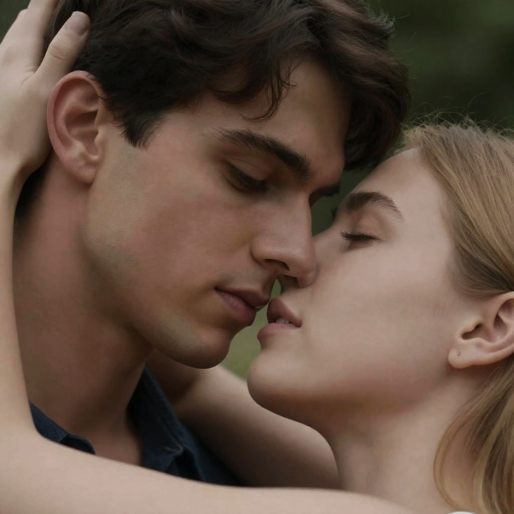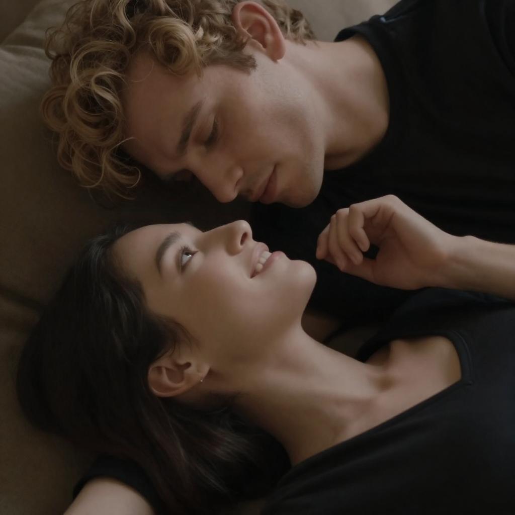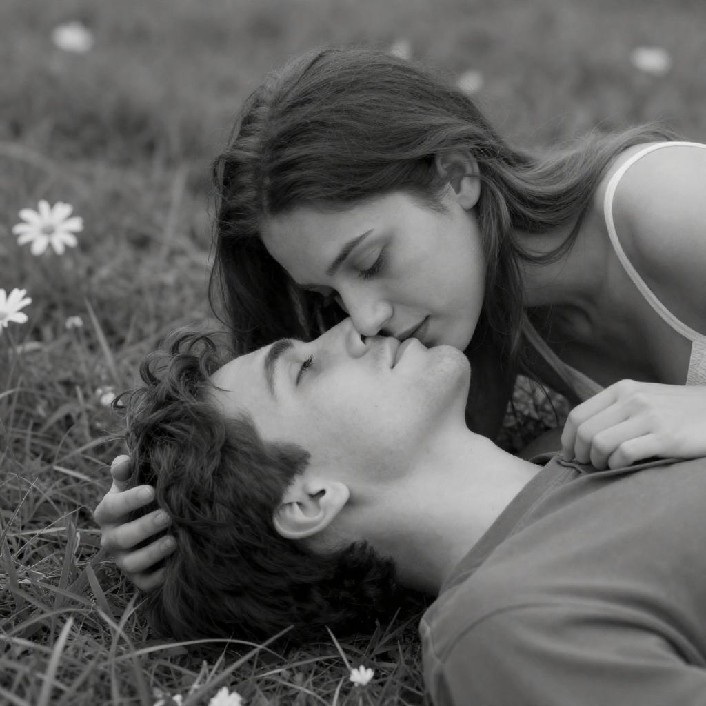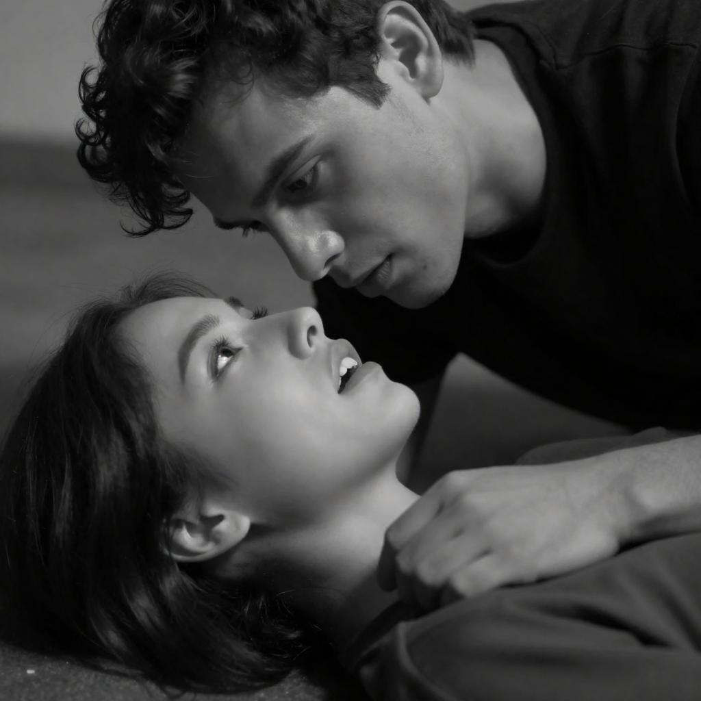 Black-and-white photograph of two people in close-up. Man with curly hair, intense expression, leaning over woman with short hair, open mouth, lying down. Man's hand near woman's face. Dramatic lighting. Upper body focus. Both wearing dark clothing.