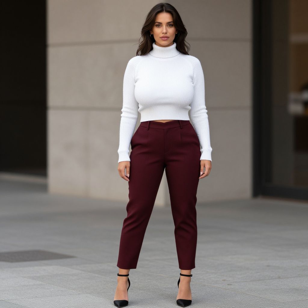 "Woman, business casual, ribbed white turtleneck sweater, cropped at the waist, burgundy tapered trousers with front seam, cropped above the ankle, black ankle strap heels.. Sexy. Pretty face and beаutiful eyes. Big breasts."