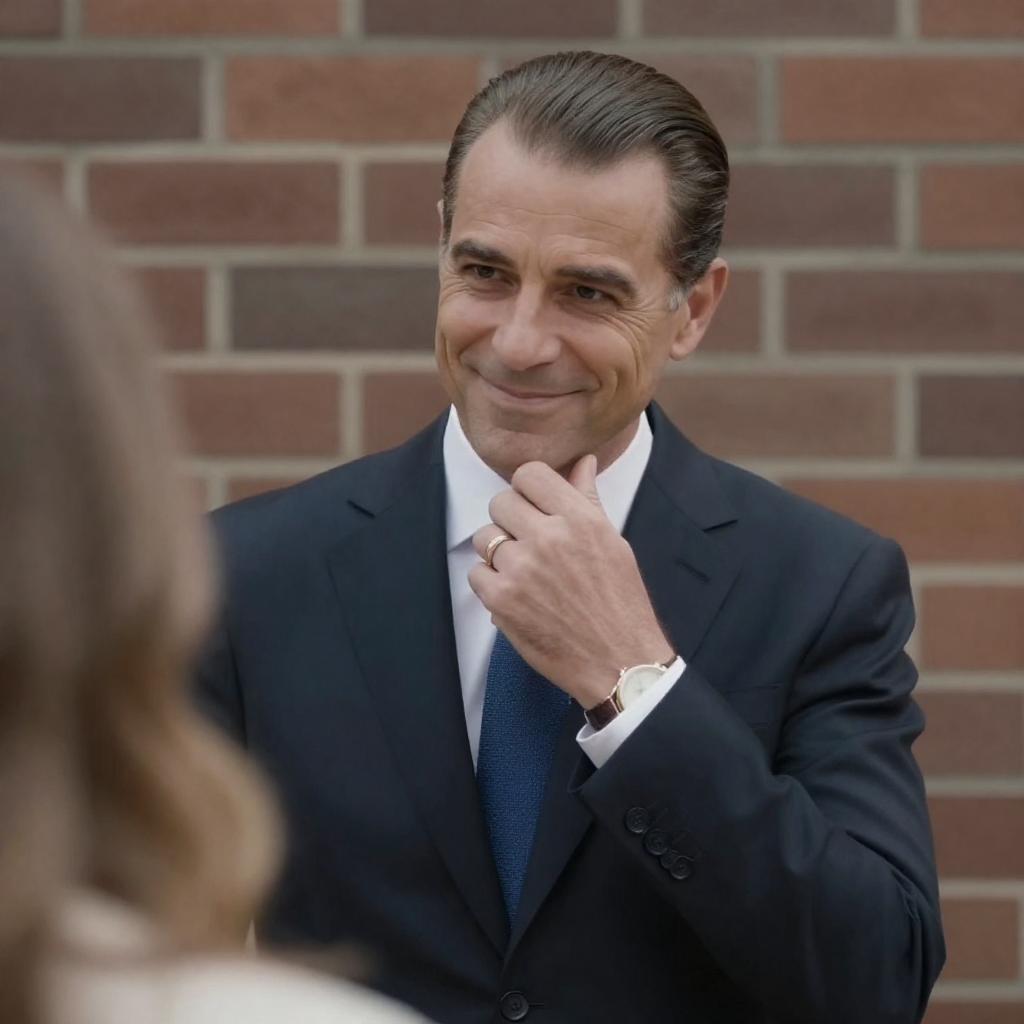 Photograph of a middle-aged man with slicked-back brown hair, wearing a dark suit, white shirt, and blue tie, standing against a rustic brick wall. He is smiling and touching his chin with his right hand, which has a gold ring and watch. A blurred blonde person is partially visible in the foreground.