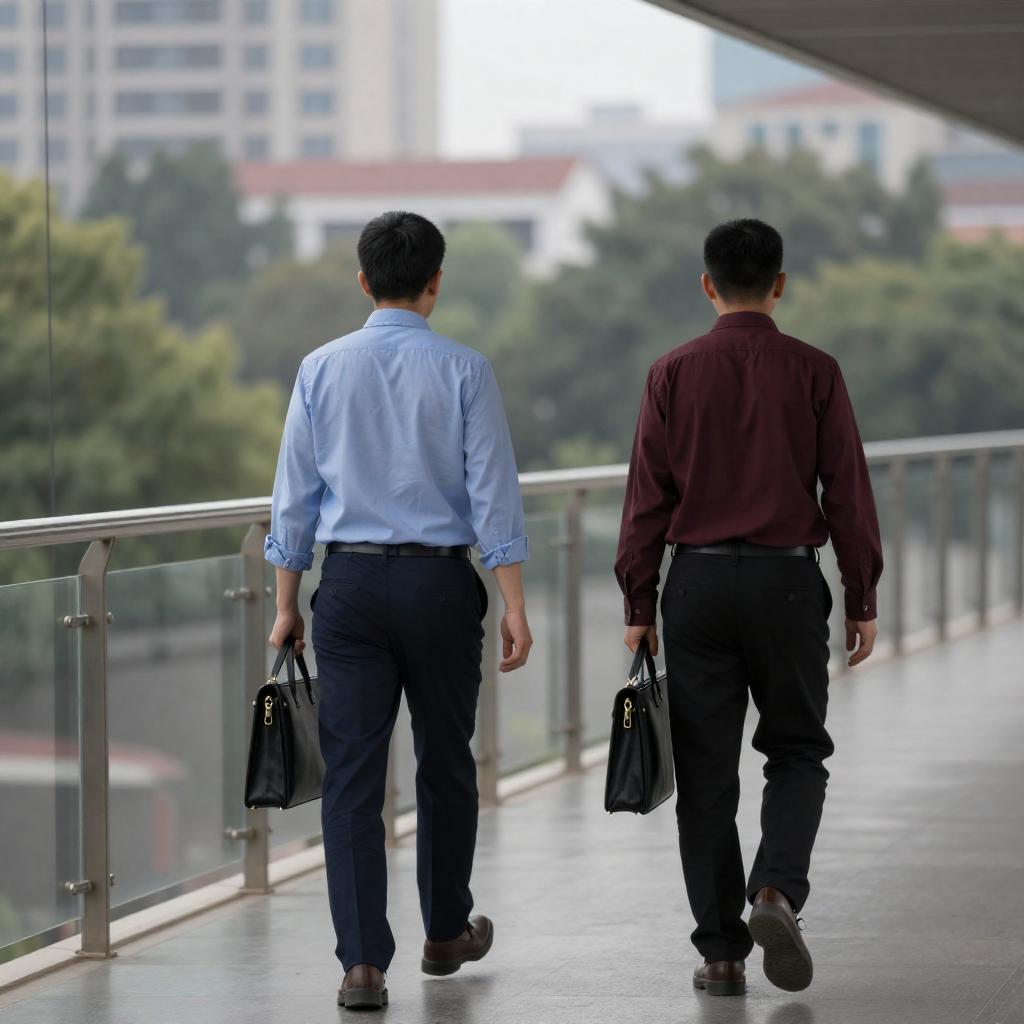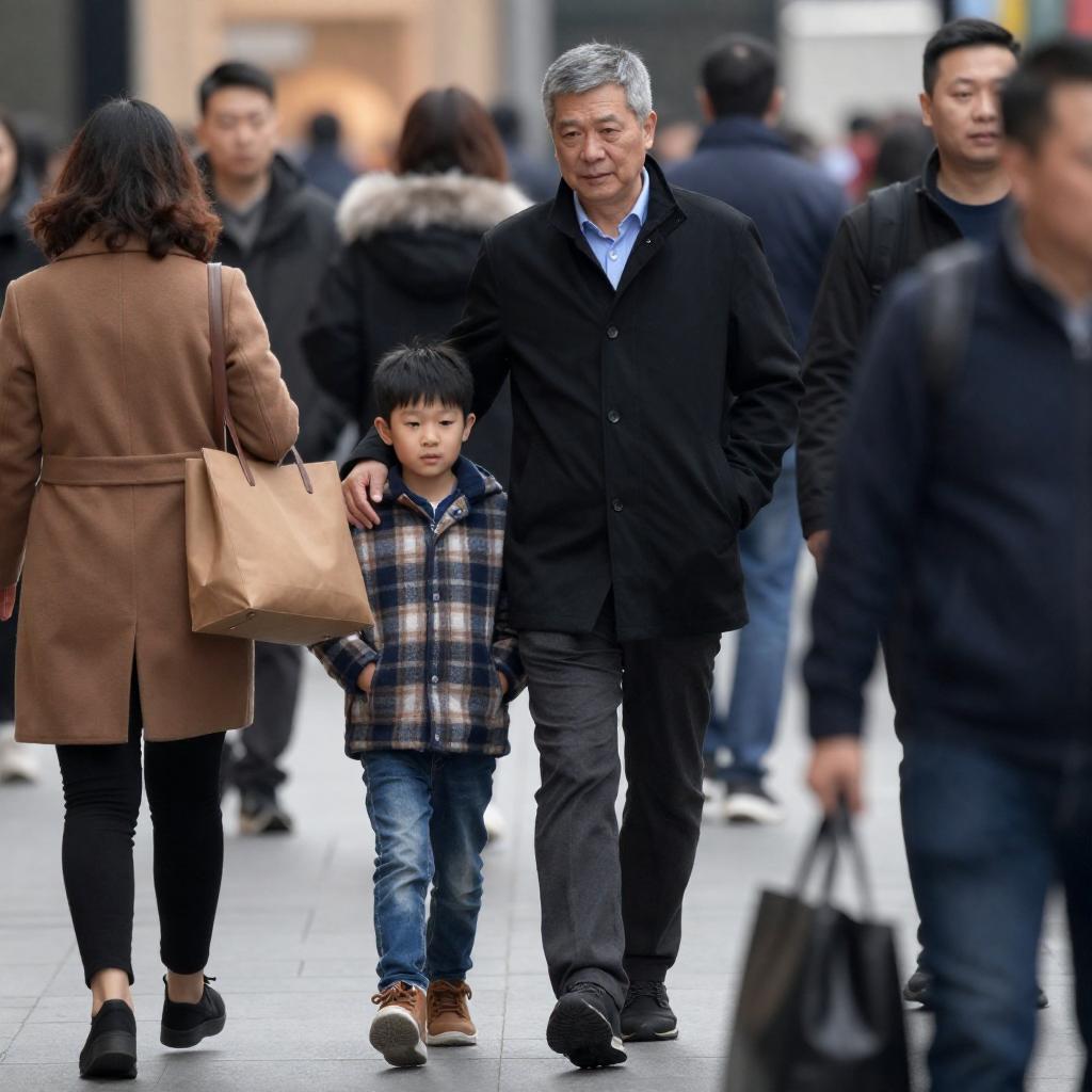 Photograph of a bustling street scene with a red-hooded person in a stroller with a white blanket in the foreground, surrounded by pedestrians and cyclists. Background includes blurred cars and trees, with sunlight filtering through. People wear casual and business attire, creating a dynamic, urban atmosphere.