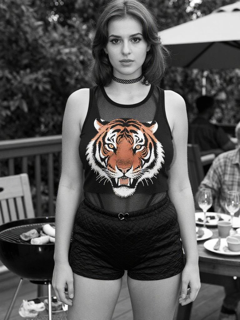 Photograph of a young woman with light skin and shoulder-length dark brown hair standing outdoors in a backyard. She wears a black tank top with a vivid, detailed orange and white tiger face graphic on the chest, black shorts, and a black choker necklace. The background is blurred but shows a barbecue grill, a table with wine glasses, and an umbrella, suggesting a casual outdoor gathering. The image has a selective color effect, with the woman's tank top and tiger graphic in color, while the rest of the image is in grayscale.