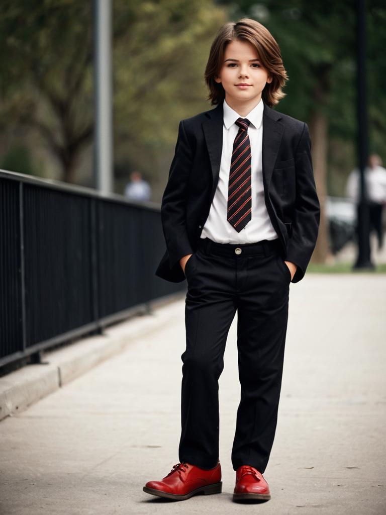 Jumpsuit formal attire, 1boy, male focus, solo, necktie, suit, formal, hands in pockets, pants, shirt, black necktie, jacket, white shirt, shoes, full body, looking at viewer, standing, collared shirt, blurry background, blurry, brown hair, black pants, red footwear