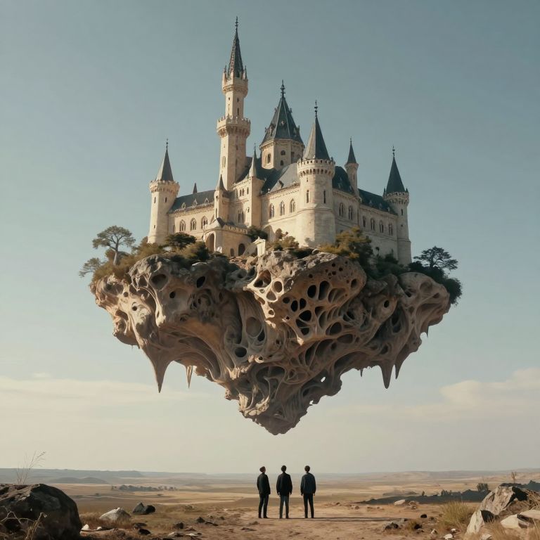 Surreal castle perched atop a floating, organic rock formation hovers above a desolate landscape, its intricate architecture mirrored by three figures standing below, gazing upward in awe as the vast sky stretches endlessly around them.