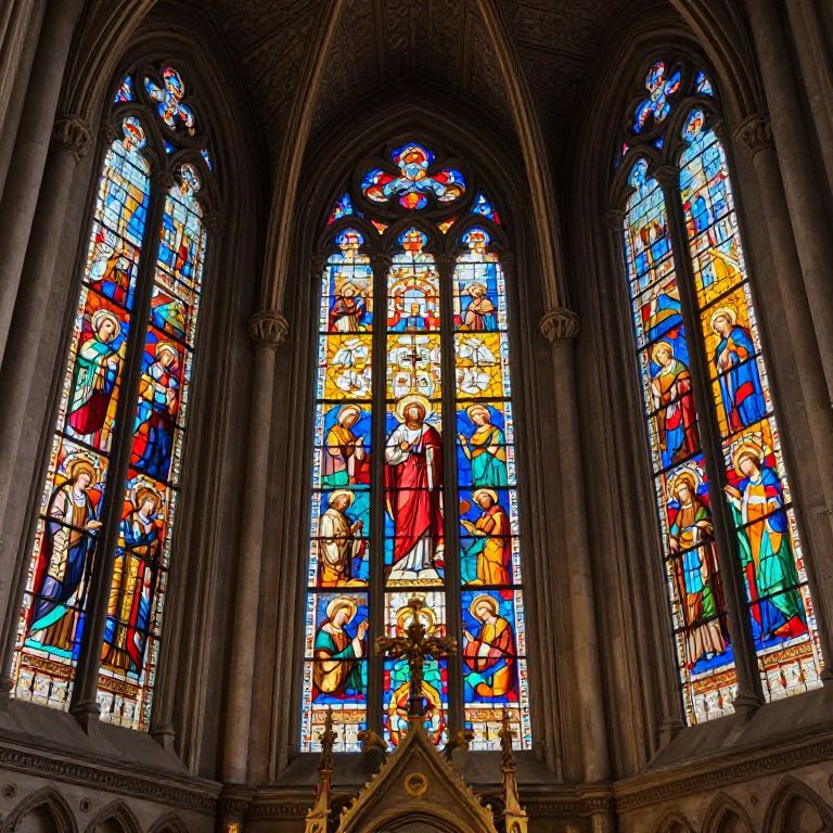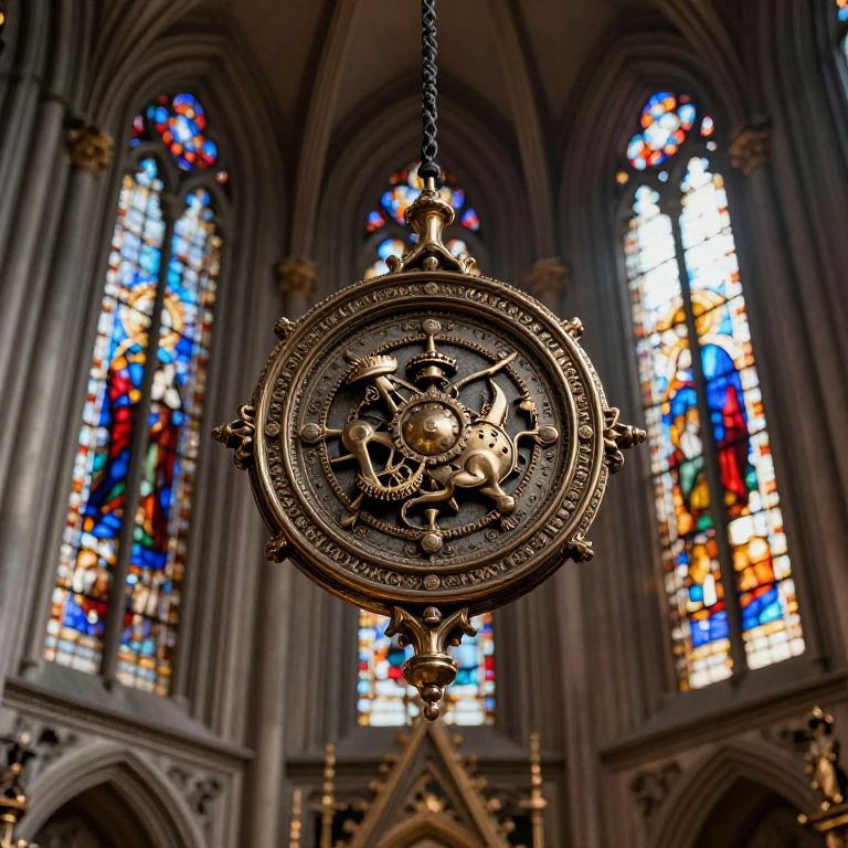 Medalion suspended in mid-air inside a grand cathedral, beams of colored stained glass illuminating its intricate carvings, mix of gothic and steampunk elements with metallic textures, sacred and awe-inspiring mood, hyper-realistic, dramatic lighting.