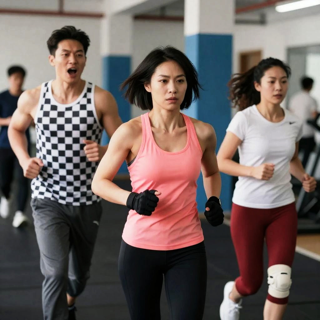 Photograph of three people running in an indoor gym. Foreground: muscular woman with short black hair, pink tank top, black pants, black gloves, intense expression. Left: muscular man, black-and-white checkered tank top, grey pants, shouting. Right: woman with curly hair, white t-shirt, red pants, white knee brace, focused expression. Gym background with white and blue pillars, blurred people.