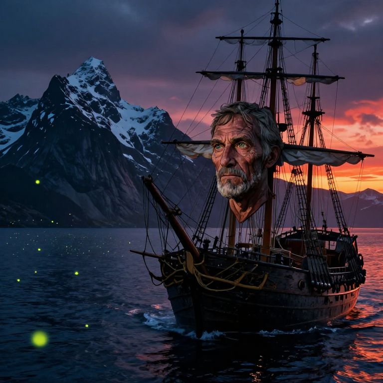 A vivid digital artwork depicts an elderly man with a weathered face and gray beard, superimposed over a dark wooden ship with tall masts, sailing through a serene, twilight ocean. Snow-capped mountains loom in the background, illuminated by a vibrant, orange-pink sunset. The water reflects the colorful sky and glows with small, green bioluminescent lights. The man's intense gaze is directed forward, and his expression conveys wisdom and resilience. The ship's rigging and sails are detailed, adding a sense of historical adventure to the scene.