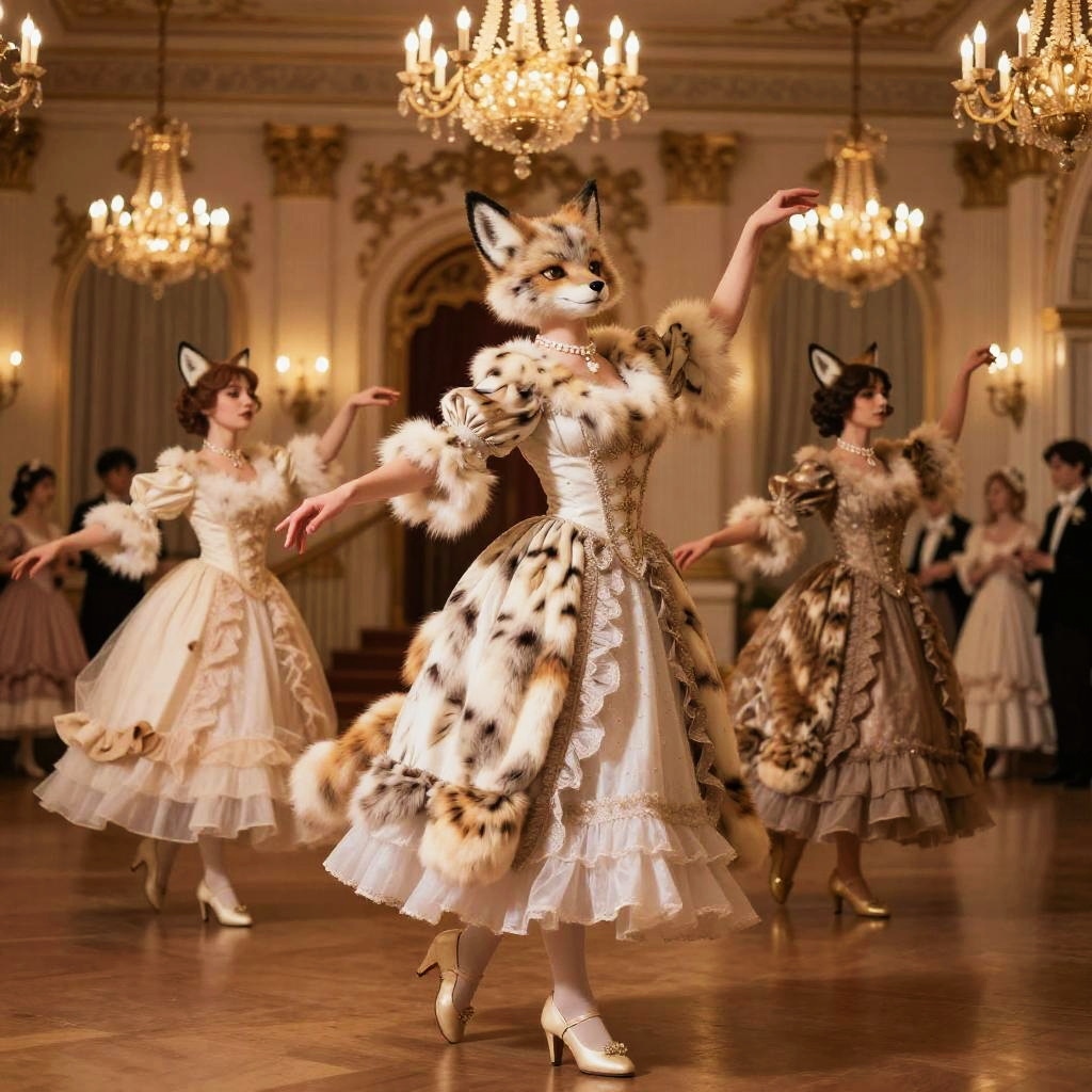 Furry female characters portrayed in an elegant ballroom setting, wearing elaborate Victorian-inspired dresses, delicate fur patterns, graceful movements captured mid-dance, surrounded by opulent chandeliers and ornate decorations with warm ambient lighting.