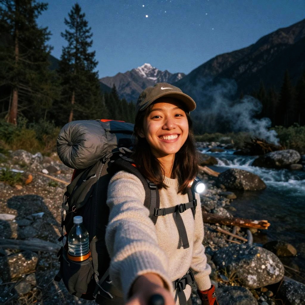 1girl:1.2), ((upper body selfie, happy)), masterpiece, best quality, ultra-detailed, solo, outdoors, (night), mountains, nature, (stars, moon) cheerful, happy, backpack, sleeping bag, camping stove, water bottle, mountain boots, gloves, sweater, hat, flashlight, forest, rocks, river, wood, smoke, shadows, contrast, clear sky, analog style (look at viewer:1.2) (skin texture) (film grain:1.3), (warm hue, warm tone:1.2), close up, cinematic light, sidelighting, ultra high res, best shadow, RAW, upper body, wearing pullover