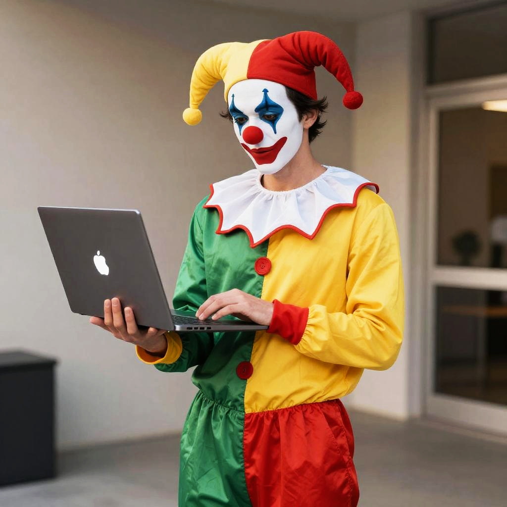Jester Outfit, dressed in a clown costume holding a laptop computer