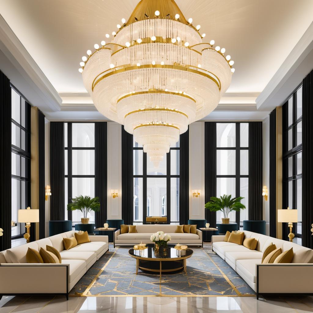 Spacious and elegant hotel lobby with high ceilings, grand chandeliers, luxurious blue and gold furniture, and large windows allowing natural light. The decor features marble flooring, ornate lighting fixtures, and lush indoor plants, creating a sophisticated and welcoming atmosphere.