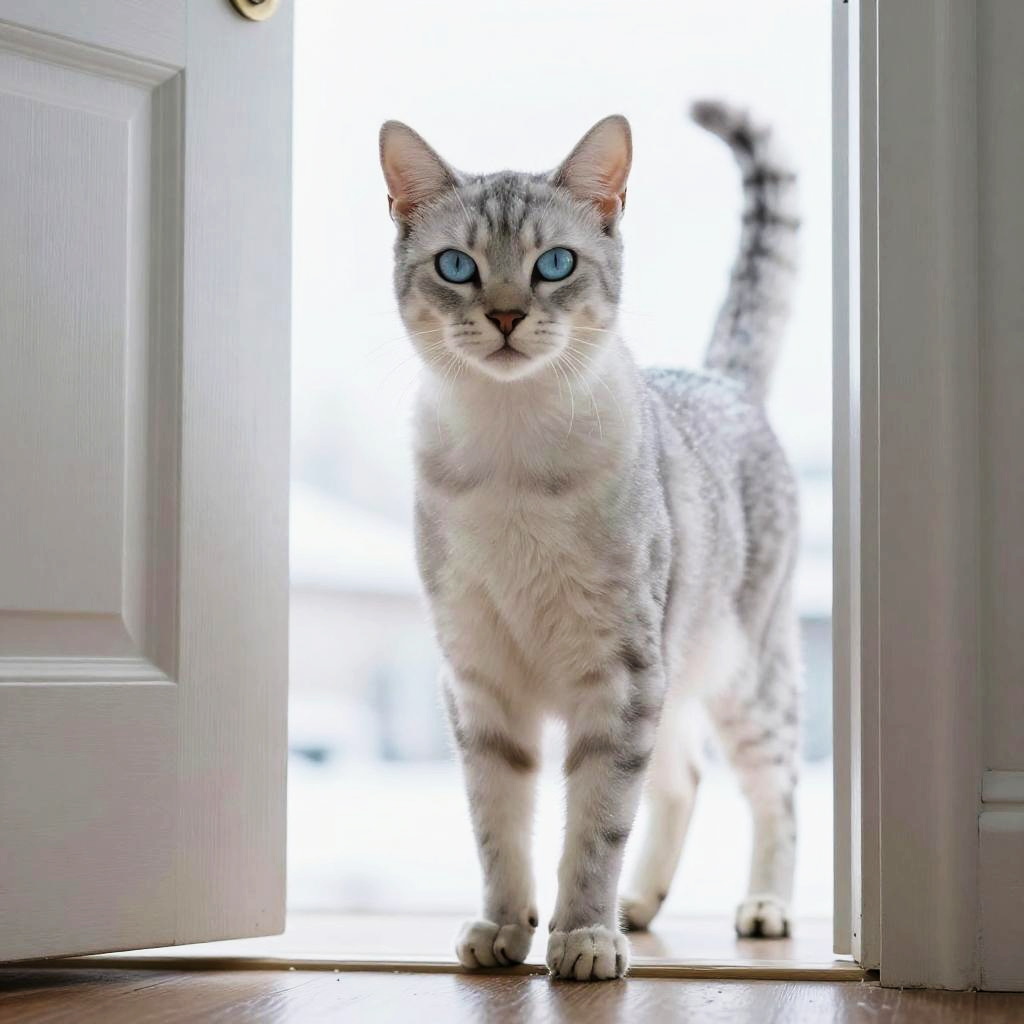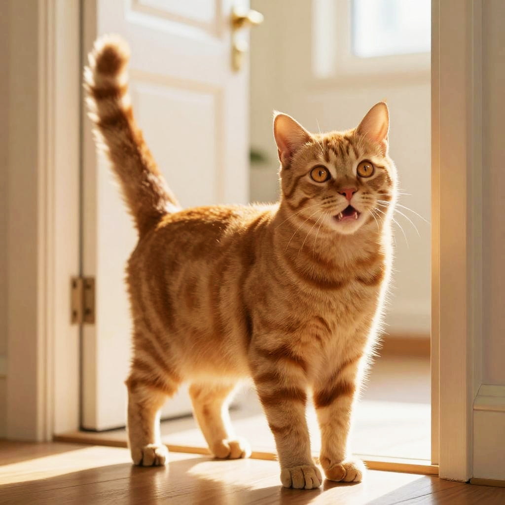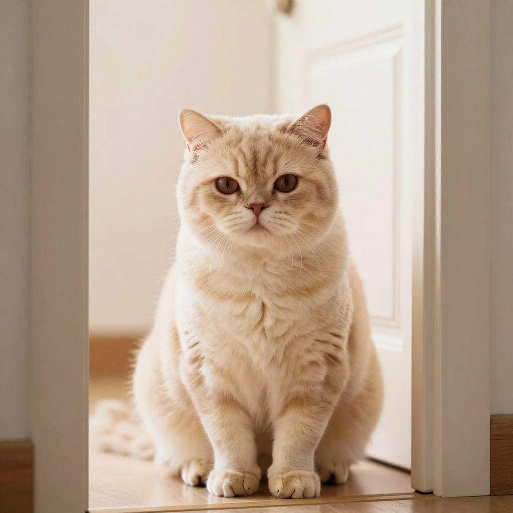 Full body, solo, cat, long-haired cream-colored feline with bushy fur, detailed fur texture, alert posture, elegant paws, warm honey-colored eyes, content smile with closed lips, cat silhouette in doorway, soft light effect, dusty rose pink