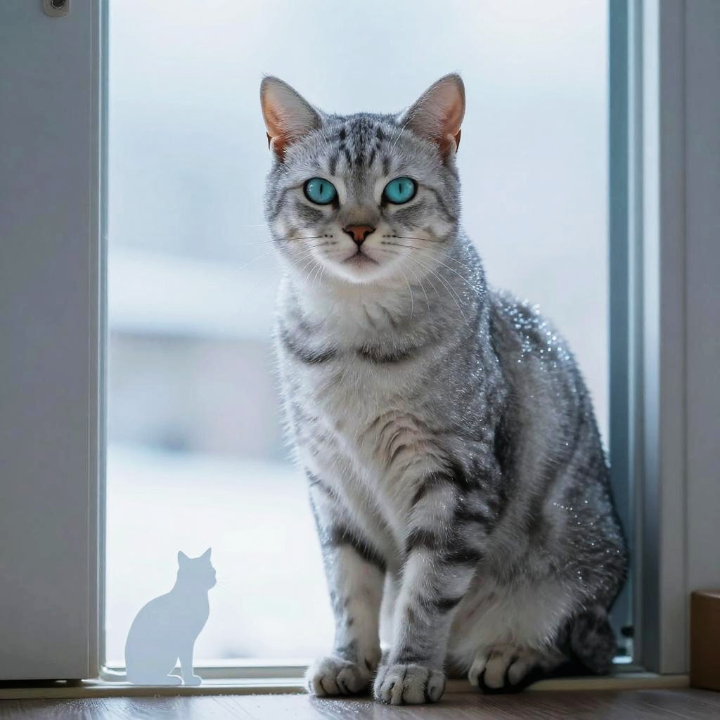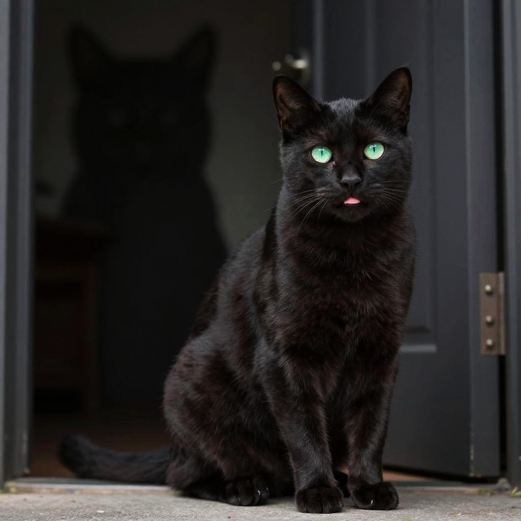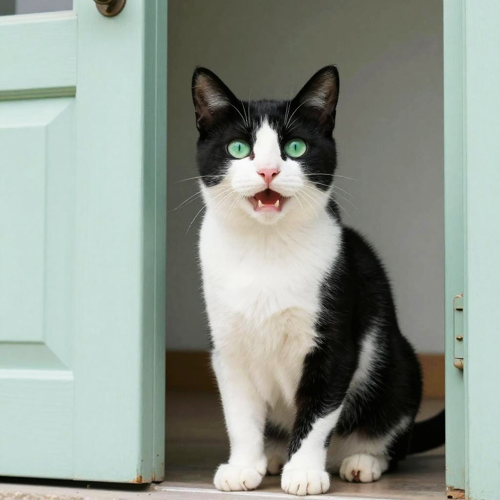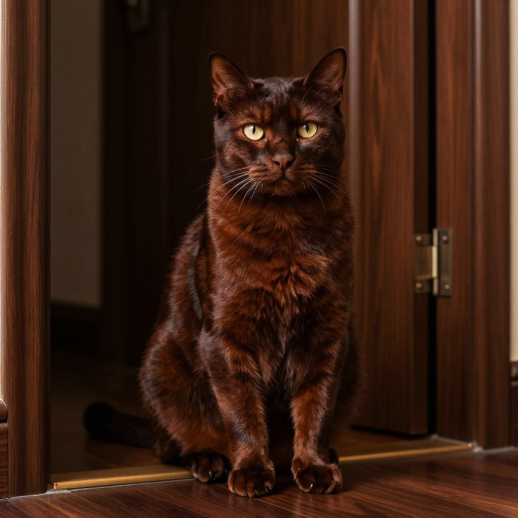 Full body, solo, cat, long-haired cream-colored feline with bushy fur, detailed fur texture, alert posture, elegant paws, warm honey-colored eyes, content smile with closed lips, cat silhouette in doorway, soft light effect, dusty rose pink