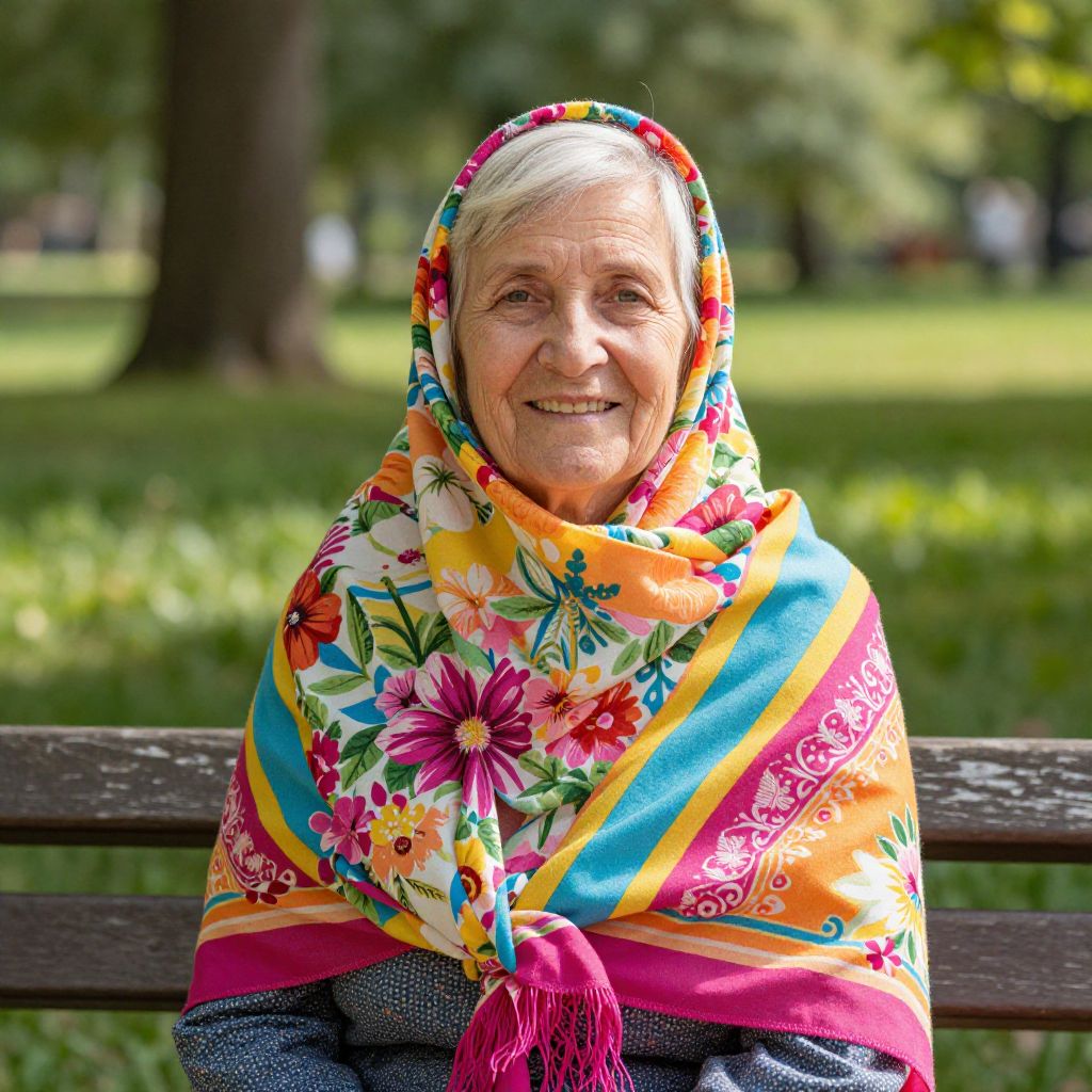 Portrait of a cheerful elderly woman wearing a bright floral headscarf and matching colorful shawl, sitting on a wooden bench in a sunny green park during daytime.