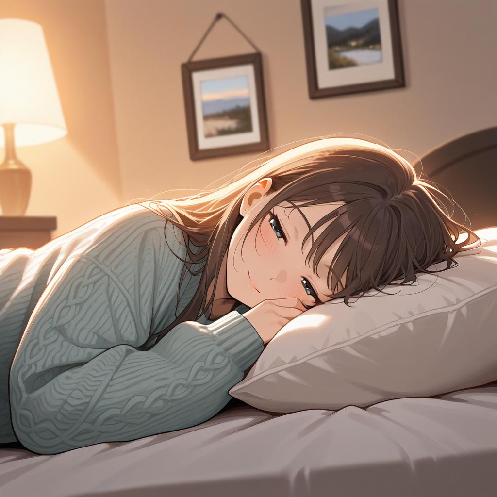 Digital illustration of an anime-style girl with short pink hair and bright yellow eyes. She wears a red and white sweater, resting her chin on her hand with a gentle smile. The soft lighting and detailed shading highlight her expressive face in a calm indoor setting.