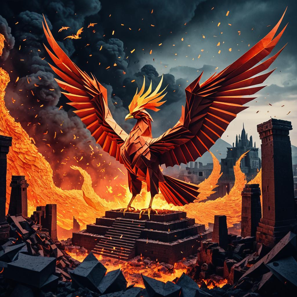 A detailed depiction of a mythical phoenix with fiery red and orange feathers, spreading its wings wide inside crumbling stone castle ruins. The scene is illuminated with dramatic Renaissance-style lighting, highlighting the bird's vibrant plumage and the textured ancient stone archway. Rubble is scattered across the stone floor, adding to the atmosphere of decay and mystery.