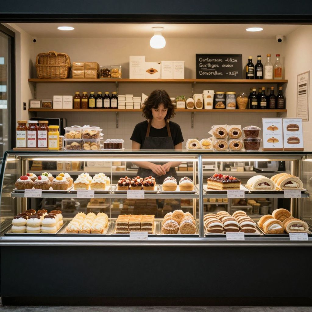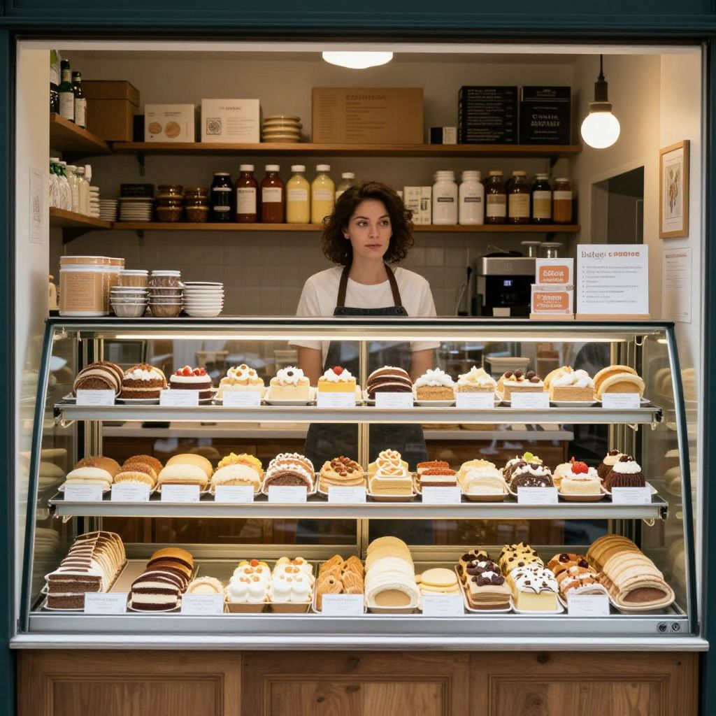 Photograph of a young woman with curly brown hair, light skin, and wearing a white shirt and black apron, standing behind a glass display case in a bakery. The display case showcases an array of colorful, intricately decorated pastries, including cupcakes, cream puffs, and cakes with various toppings. Shelves behind the woman hold jars, plates, and a "Today's Specials" sign. The background has warm, wooden textures and soft lighting. The overall atmosphere is cozy and inviting, with a focus on the vibrant pastries and the attentive baker.