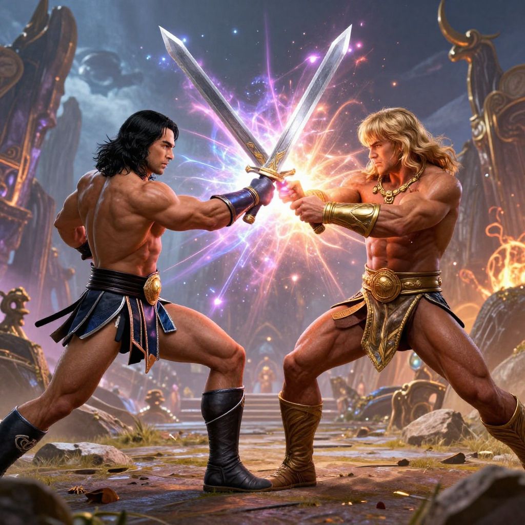 Conan vs He Man intense battle scene in a fantasy landscape, muscular warriors clashing swords with epic magical energy bursts, dramatic lighting, detailed armor and heroic poses, dynamic action, vivid colors, cinematic composition.